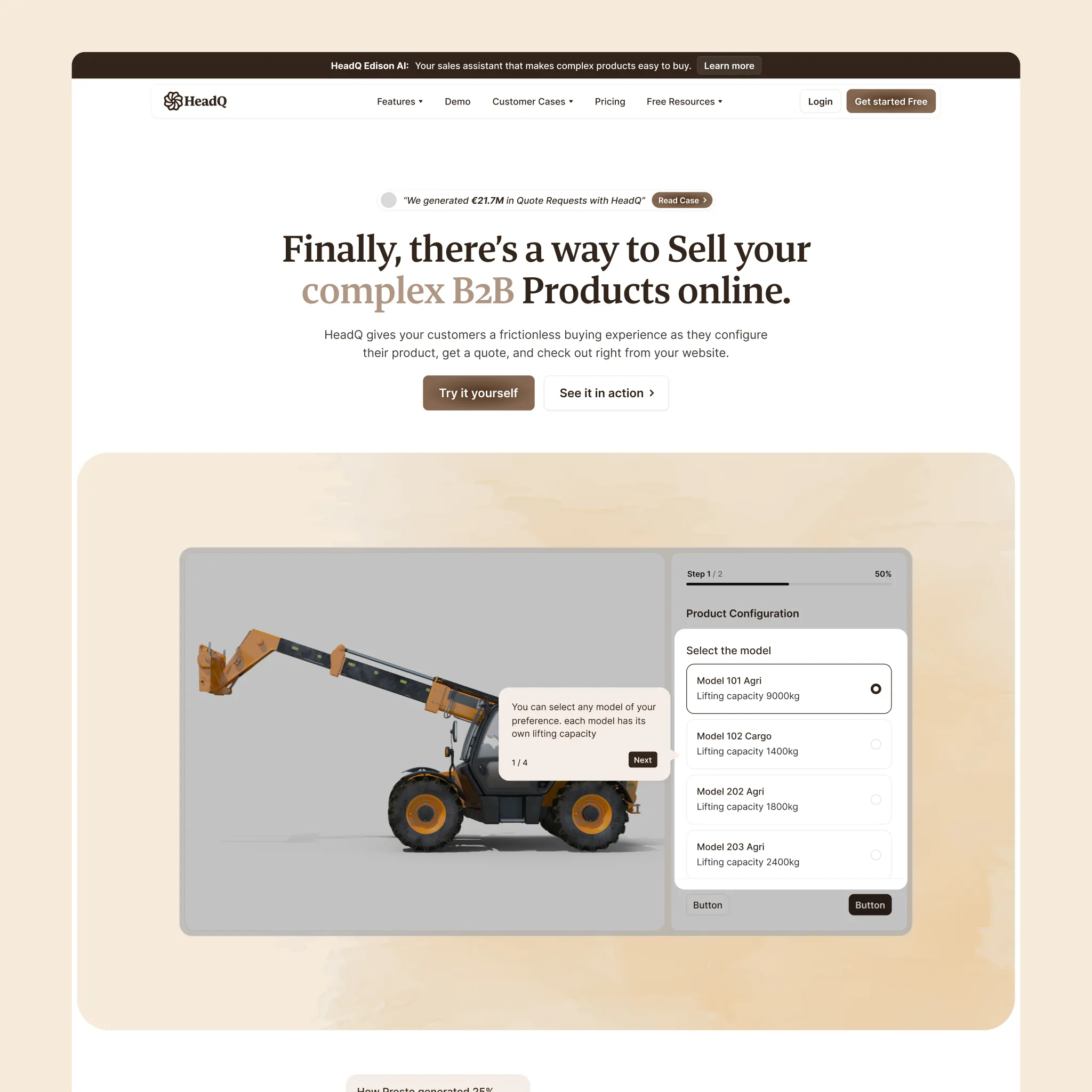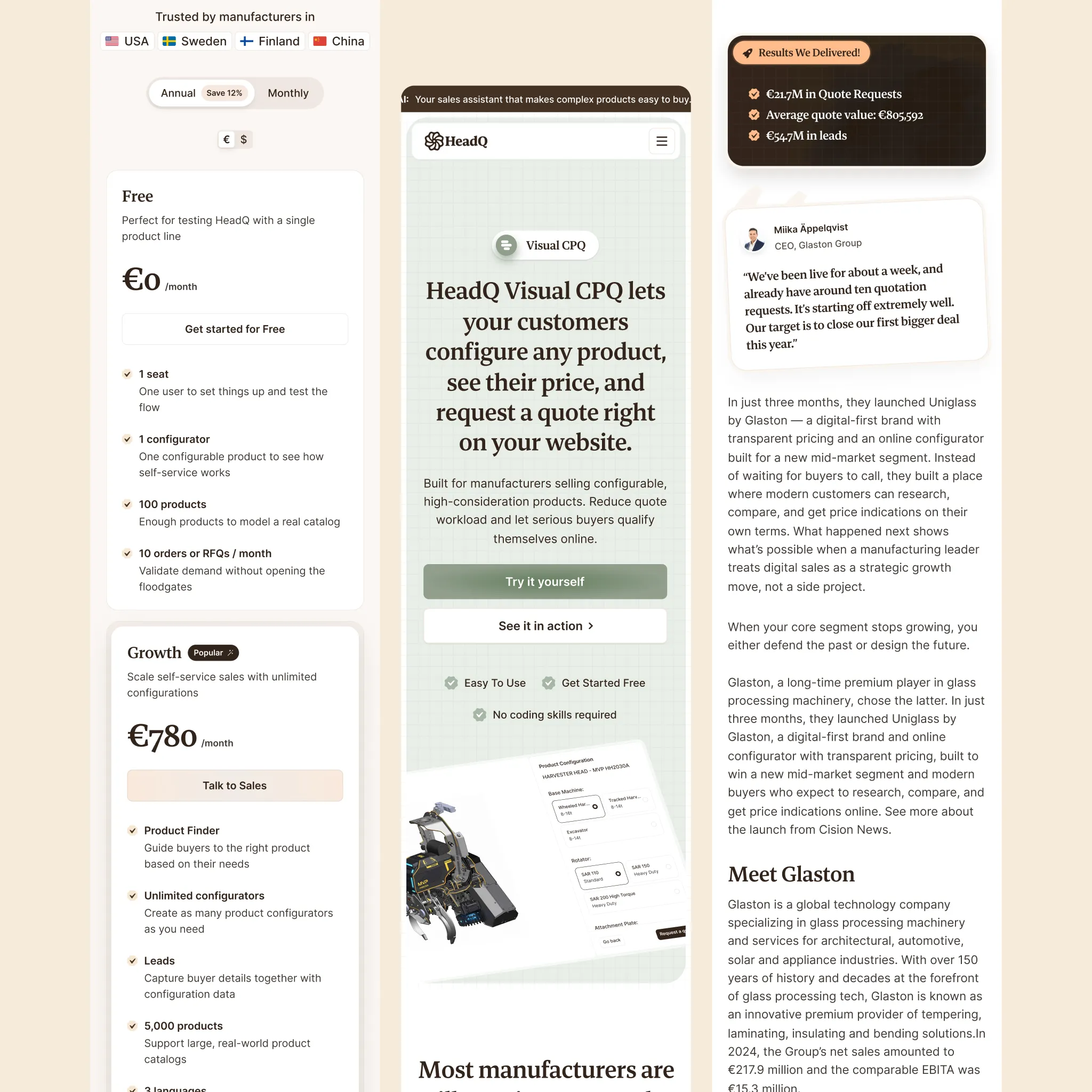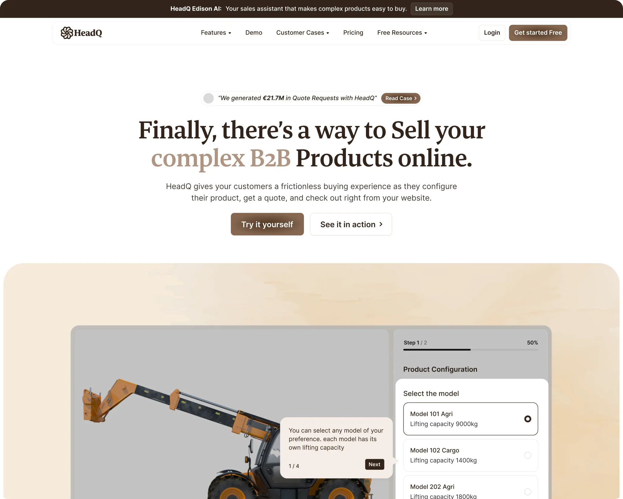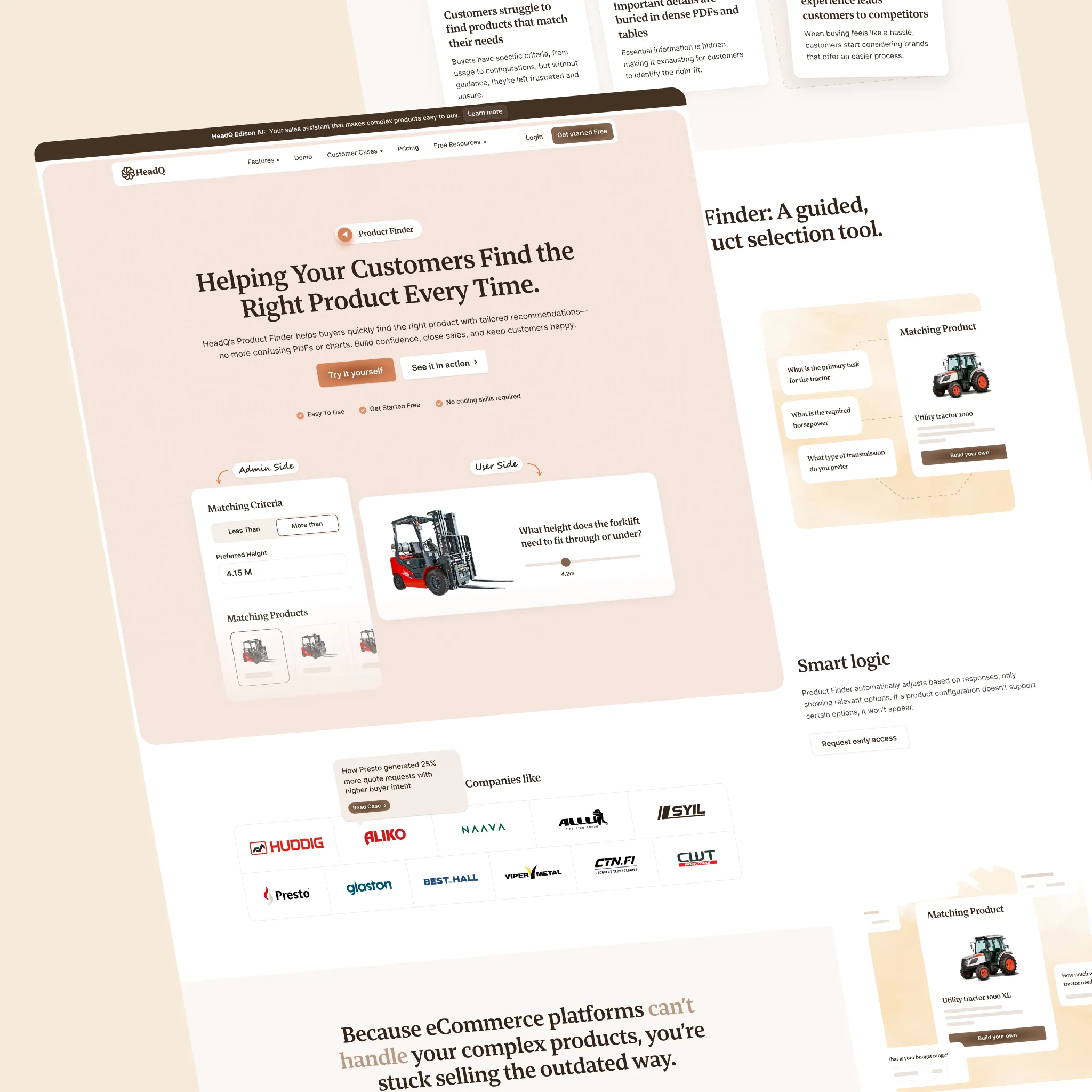 HeadQ helps companies sell complex B2B products online — visual product configurators, quote carts, checkout flows, the works. Their customers are manufacturers, industrial companies, service businesses. People selling things that don't fit in a Shopify template.