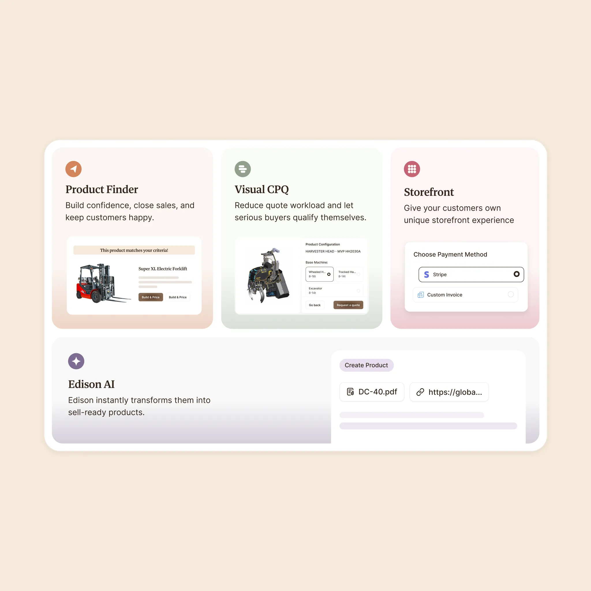 Sub-Products Got Their Own Visual Identity. HeadQ has multiple products (Visual CPQ, Checkout, Product Finder, Storefront, Edison AI). We gave each one a distinct color and icon system, but kept them visually connected to the parent brand. Different enough to feel like their own thing. Similar enough to feel like they belong to the same family. It's a harder balance than it sounds.