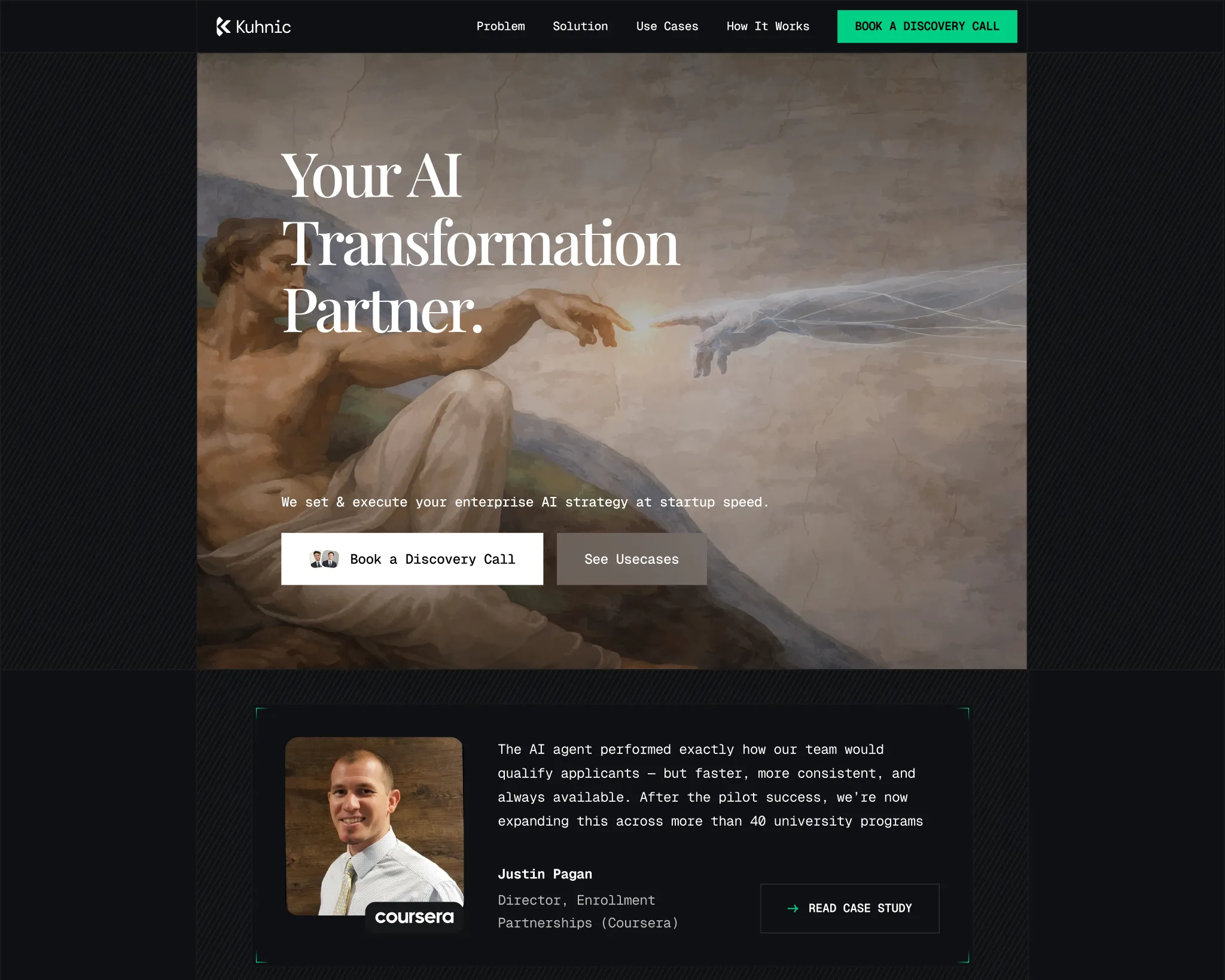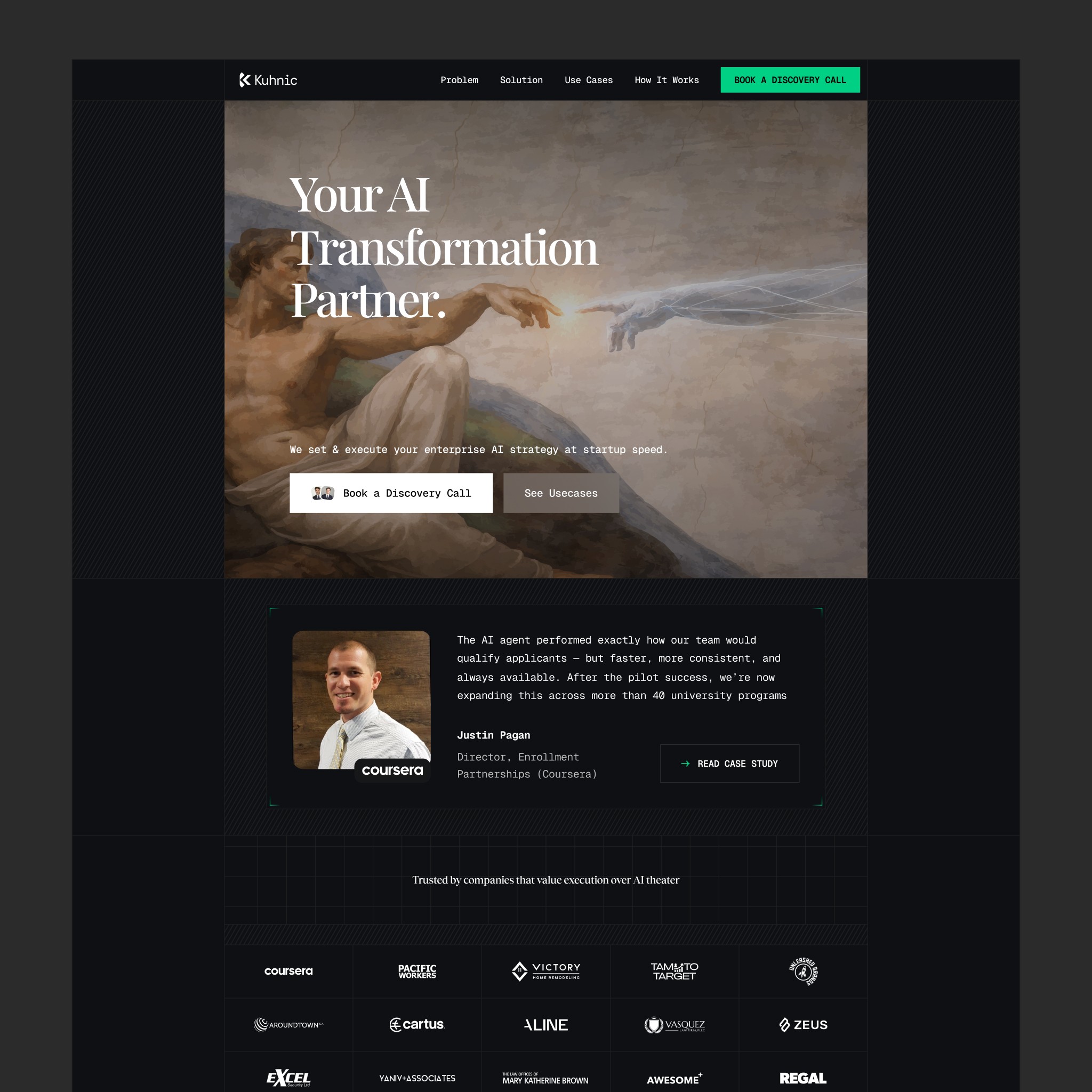 Kuhnic is an enterprise AI partner. Voice agents, AI systems, automations, app development — they help companies remove operational friction with AI. Serious work for serious companies like Coursera and AroundTown.