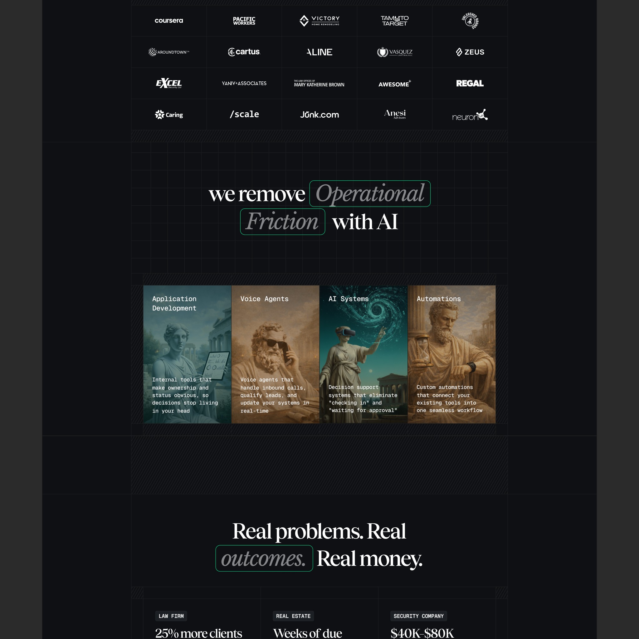 So we designed the entire website through that lens. Not with Greek columns and marble textures (that would be terrible). But with the philosophy of Greek architecture — precision in proportion, intentional detail, complexity that presents as simplicity. Every spacing decision, every type choice, every visual element was designed to communicate that this is a company that obsesses over craft.