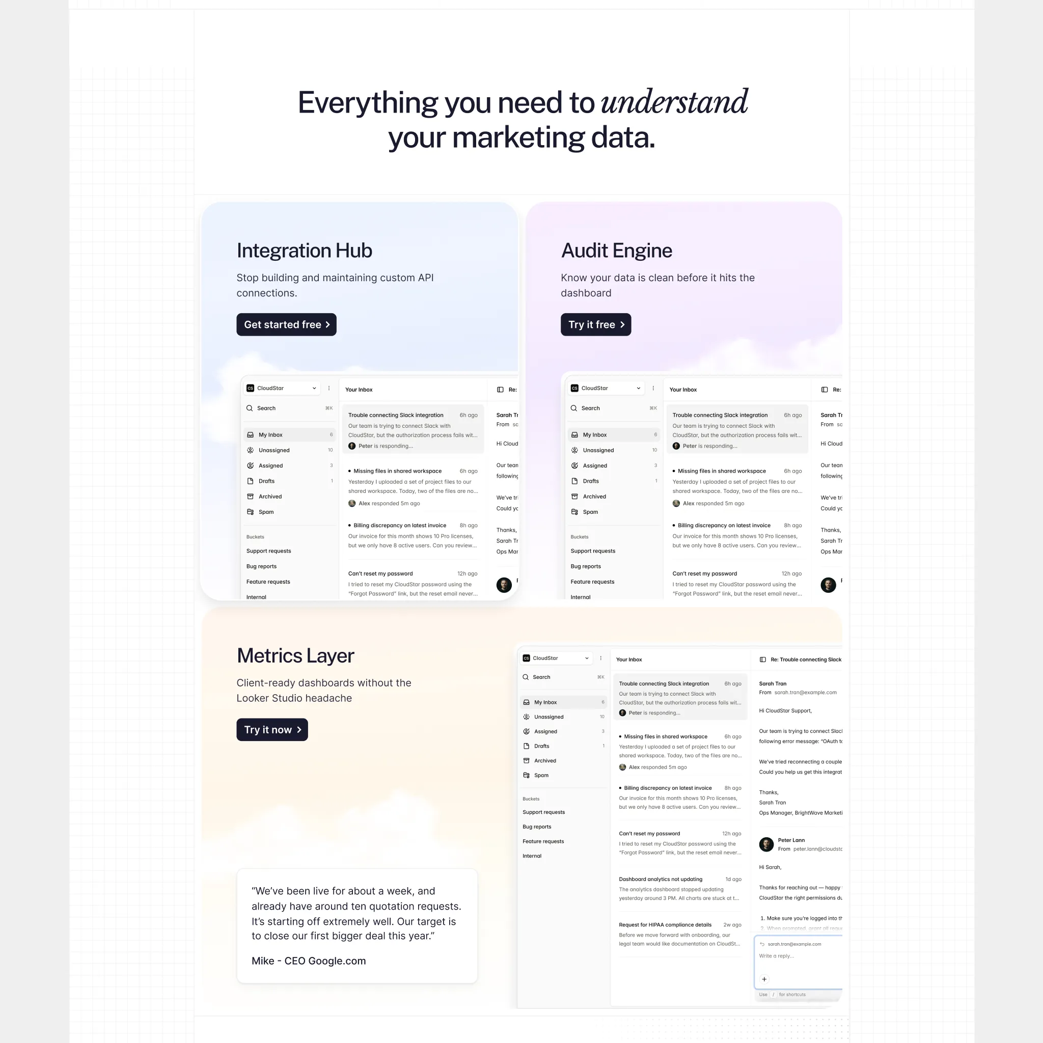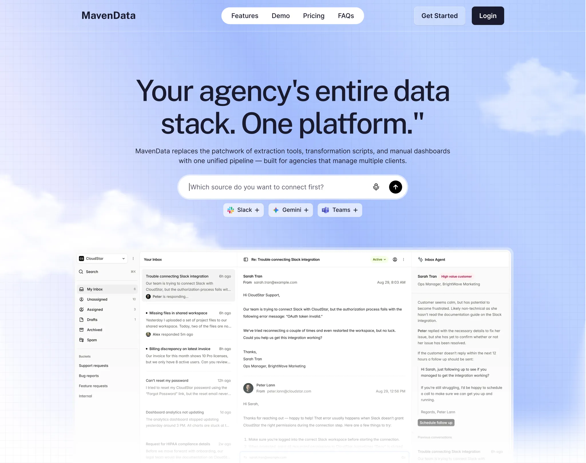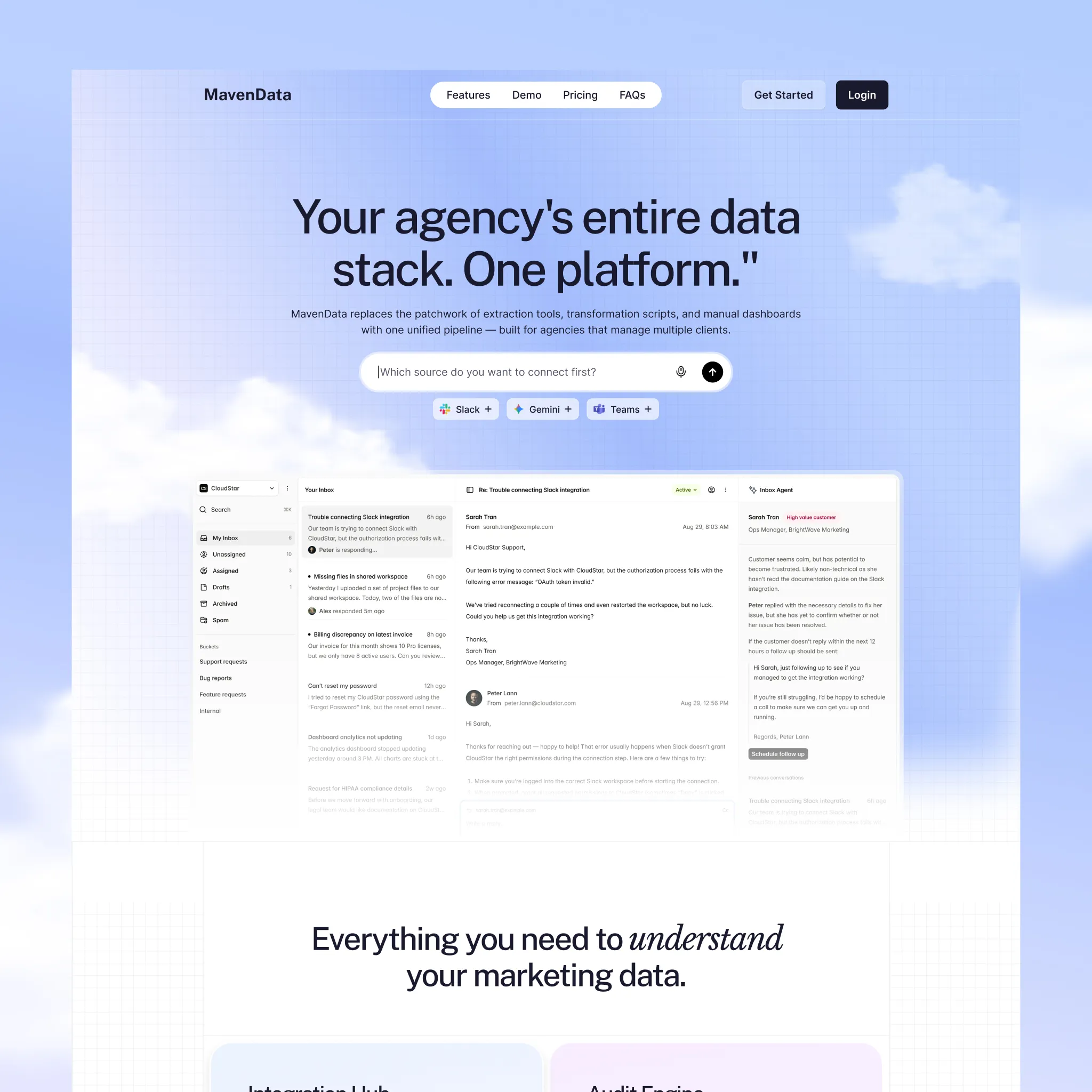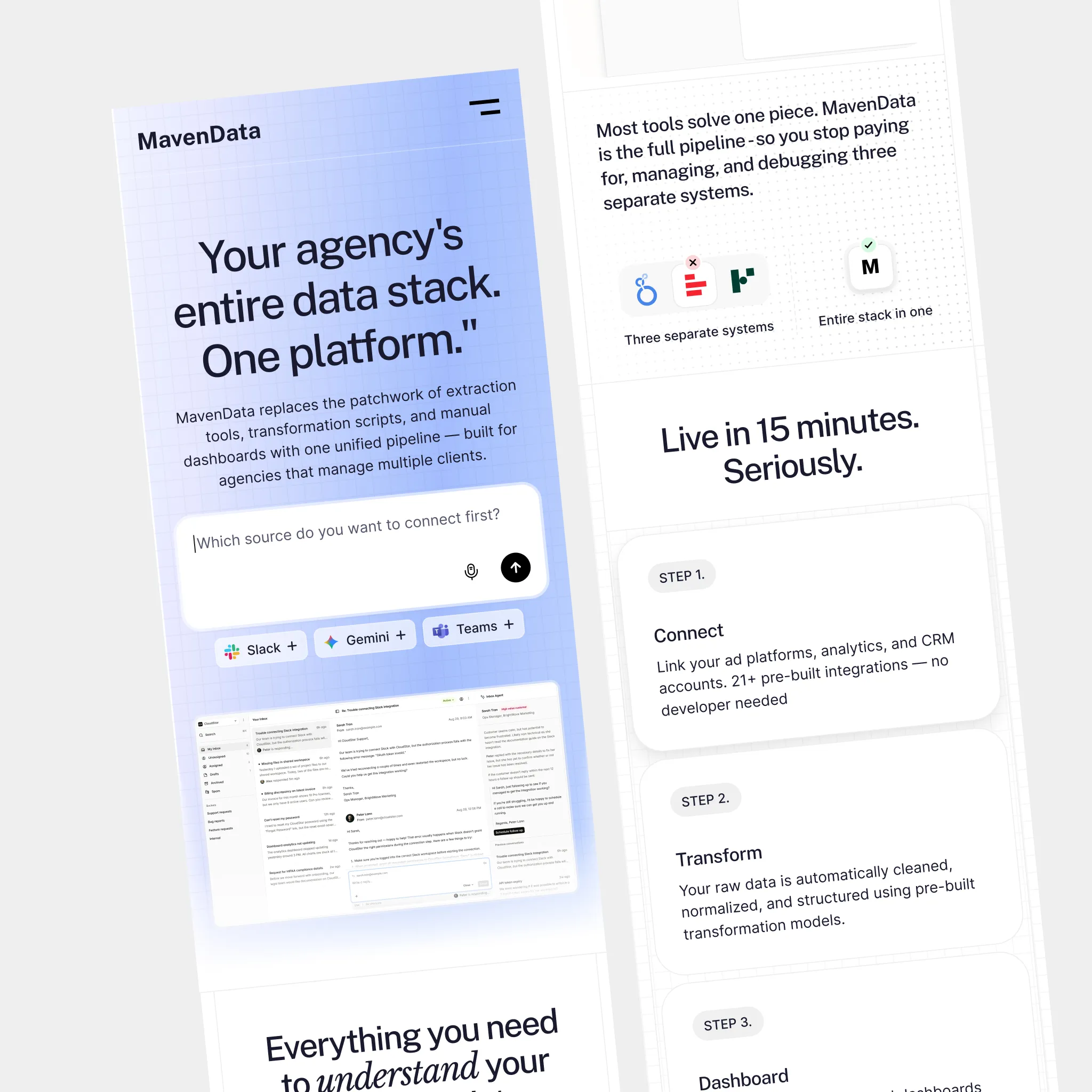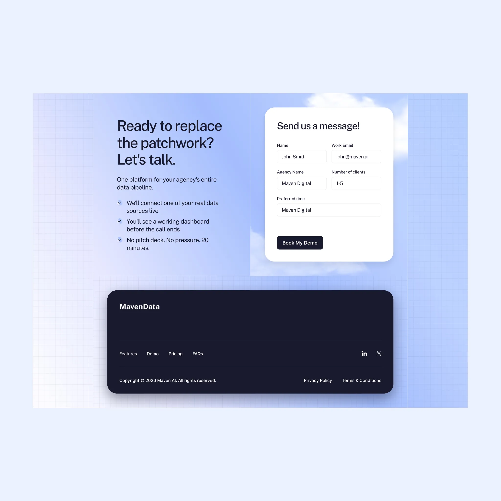 MavenData is the platform that makes marketing analytics accessible — UTM tracking, report building, data audits, automated pipelines, all without writing a single line of code. They were planning to launch and needed a homepage fast. Not "fast and mediocre." Fast and right.